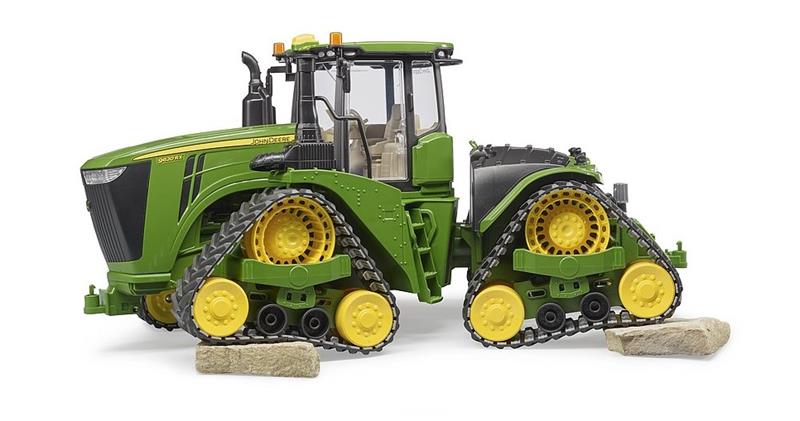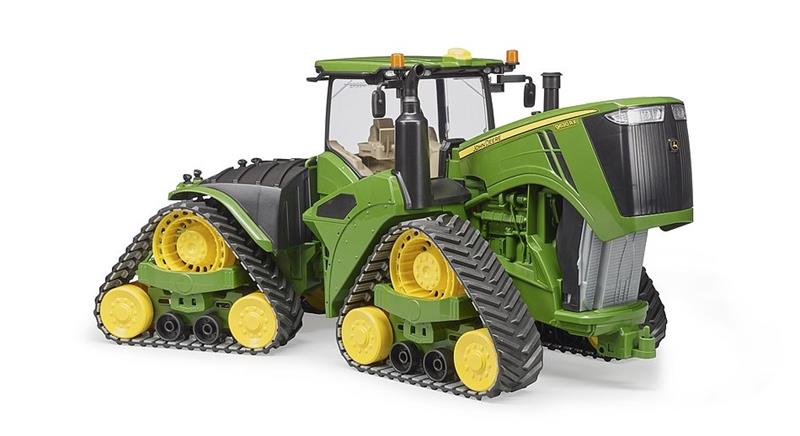 As demands to modern farms are ever increasing, it is more than important nowadays to boost your machines output. The 9620RX is John Deeres most powerful and largest crawler drive tractor. Thanks to an engine output of up to 670 hp and its four crawler drives, providing it with stunning tractive power and simultaneously the best possible protection for the soil, this vehicle is the perfect partner when heavy-duty pulling using attachments, such as grubber, plough and sewing combinations, are required. This impressive tractor with a unique attention to detail is now also available in the BRUDER range at a scale of 1:16. Just like the real thing, the model features the recently developed crawler drive as well as the off-road articulated steering. The cab features one opening door and the impressive bonnet can also be folded upwards to showcase the massive engine. Numerous attachments from BRUDERs agricultural range are suitable for the tow coupling with height-adjustable lifting gear.