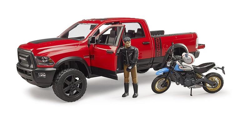 Pour de nombreuses personnes, la moto est une véritable passion. La marque prestigieuse Ducati a tiré dans le mille auprès de ses fans avec ses modèles Scrambler. La Desert Sled est une Enduro avec pneus tout-terrain profilés à clous montés sur roues à rayons métalliques. Le superbe design impressionne non seulement les vieux briscards mais aussi la nouvelle génération de jeunes motards. Cette combinaison attrayante associant le RAM et la Ducati Scambler Desert Sled fait désormais partie de la gamme de BRUDER. Le RAM est conçu pour le transport tout-terrain et peut accueillir sans problème la Ducati sur sa plateforme de chargement. Sa robustesse et ses aptitudes tout-terrain sont légendaires et uniques. Ce véhicule se montre aussi impressionnant au niveau des performances. Son moteur V8 HEMI affiche une puissance de 410 CV et atteint un couple de 582 Newton-mètres. Toutes les portières peuvent être ouvertes et la cabine peut contenir 4 figurines bworld. Pour plus de confort de conduite et de manoeuvrabilité, ce modèle à l’échelle 1:16 est équipé d’essieux à ressorts et l’essieu avant peut être dirigé grâce à la prolongation du volant incluse. Le modèle de la Ducati reprend fidèlement à l’échelle des éléments de design tels que les roues à rayons métalliques, le pot d’échappement ou les éléments de motocross. Comme l’original, le modèle BRUDER dispose d’une suspension arrière. La Ducati peut être fixée sur la plateforme de chargement par le conducteur parfaitement équipé grâce aux supports de transport inclus.