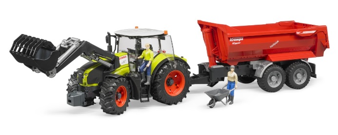 Cabine : - Capot ouvrant - Portes ouvrantes - Vitres en plastique transparent et incassable. Structure du véhicule : - Masse avant amovible - Attelage de remorque avec dispositif de levage réglable en hauteur - Châssis chargeur frontal : - Essieu avant pivotant, directionnel et tout-terrain - Roues amovibles - Pneus à crampons. Mouvement/Fonction : - Direction possible grâce à une barre de direction supplémentaire et au toit ouvrant du tracteur. Généralités : - Attention ! Ne convient pas aux enfants de moins de 3 ans. Risque d'étouffement dû aux petites pièces. - Âge recommandé : à partir de 3 ans, pour jouer à l'intérieur et à l'extérieur. - Fabriqué par Bruder - Échelle 1:16. Dimensions : 44,5 x 18 x 20,5 cm. Description de l'article : Le Claas Axion 950
