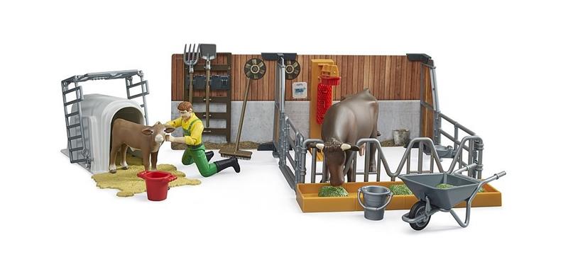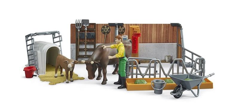 BRUDER-BWORLD COW AND CALF BARN W FARMER