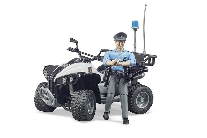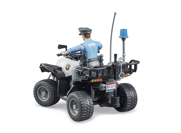 La gamme de produits BRUDER est très vaste. De nombreux véhicules pour la construction, les services durgence, les véhicules utilitaires, les loisirs, lagriculture et la sylviculture sont appréciés dans le monde entier grâce à leurs univers de jouets passionnants à léchelle 1:16. Comme dans la vie de tous les jours, laugmentation du trafic avec les véhicules BRUDER entraîne une hausse des infractions au code de la route. Cest pourquoi le bworld dispose désormais dune police qui veille au respect de la loi et de lordre. Un quad allie les dimensions compactes dune moto et la flexibilité dun véhicule tout-terrain. Il nest donc pas étonnant que la police utilise de plus en plus souvent des quads. Le quad BRUDER convainc par un design policier très moderne qui fait impression dans les activités quotidiennes comme sur les terrains de cross difficiles lors dune poursuite. La suspension sur les deux essieux et lessieu avant directeur rende le quad très agile et permettent une manoeuvre précise, même sur les terrains les plus difficiles. Avec son porte-bagages amovible, son attelage à la barre dattelage et ses supports pour les outils, le quad convient parfaitement comme véhicule de service durgence au quotidien. La réplique du véhicule et le policier bworld confèrent à lensemble un aspect très réaliste. Une poignée fixe sur le guidon et un siège adapté à une position sportive du pilote permettent à ce dernier de ne jamais perdre le contrôle, même en cas de course sur un terrain accidenté. Le policier bworld est entièrement équipé pour renforcer lautorité. La ceinture comporte des outils importants pour le travail quotidien de la police, tels quune torche, un appareil radio et une matraque.