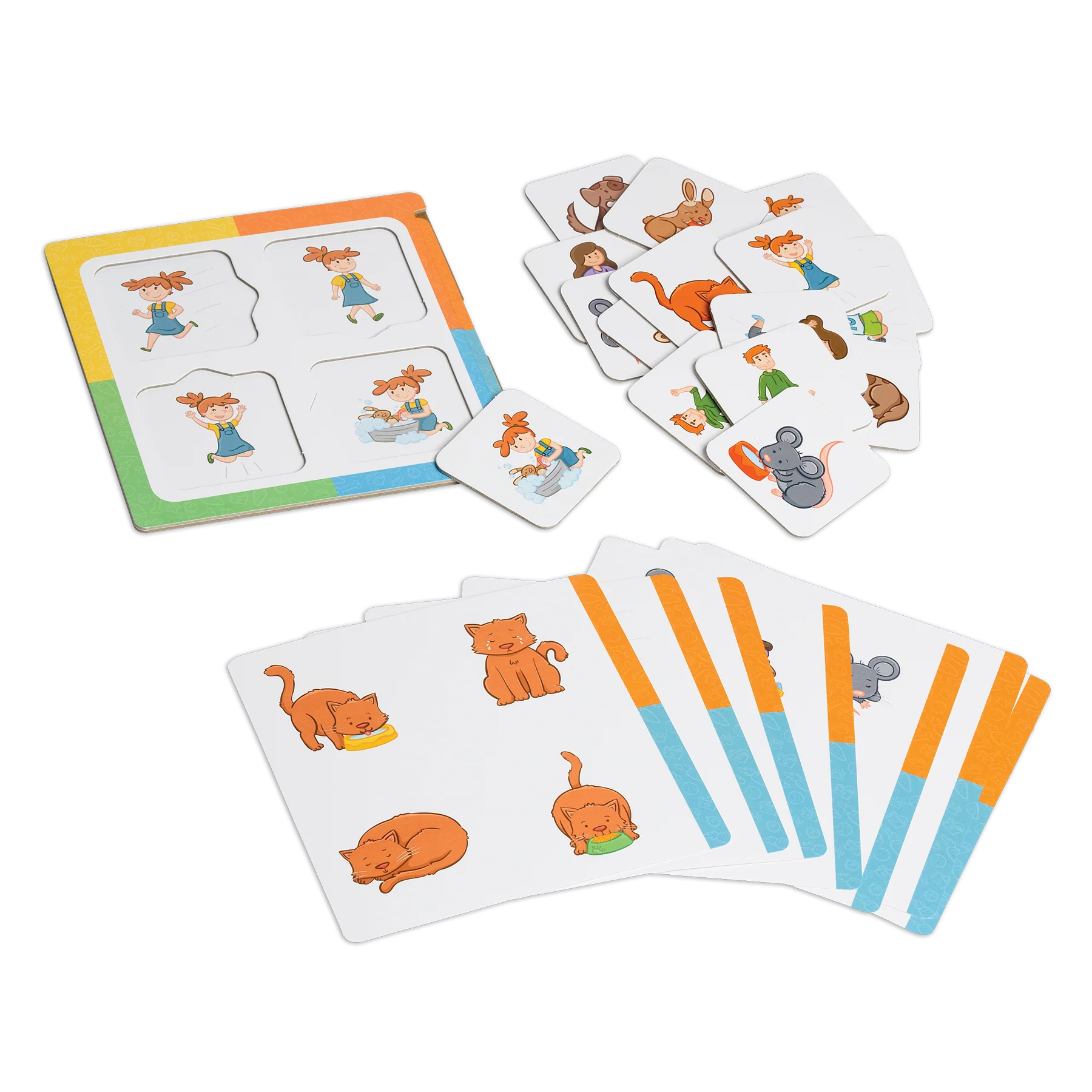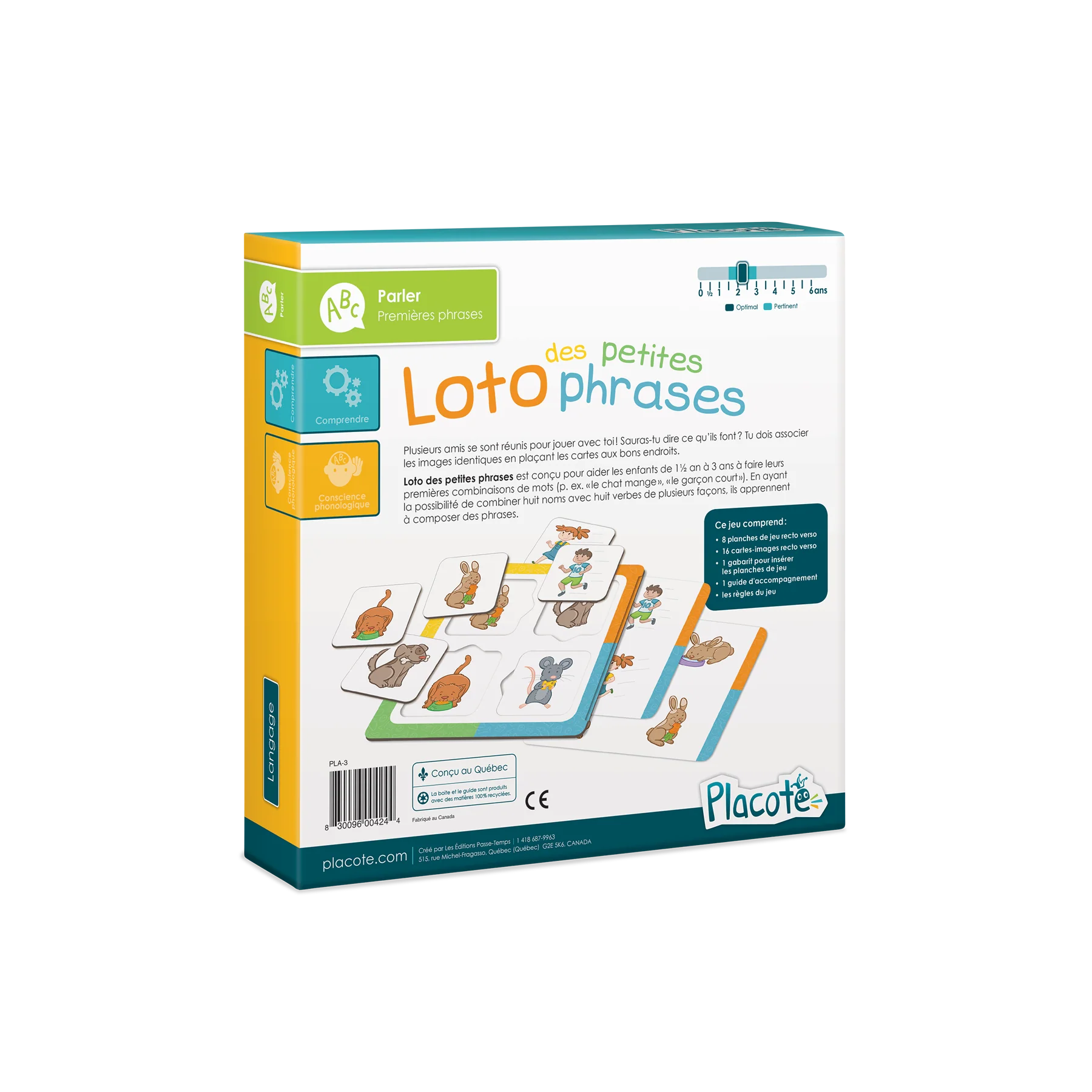 Objectif : Premières phrases Plusieurs amis se sont réunis pour jouer avec toi! Sauras-tu dire ce qu’ils font? Tu dois associer les images identiques en plaçant les cartes aux bons endroits. Loto des petites phrases est conçu pour aider les enfants de 1½ an à 3 ans à faire leurs premières combinaisons de mots (p. ex. «le chat mange», «le garçon court»). En ayant la possibilité de combiner huit noms avec huit verbes de plusieurs façons, ils apprennent à composer des phrases.