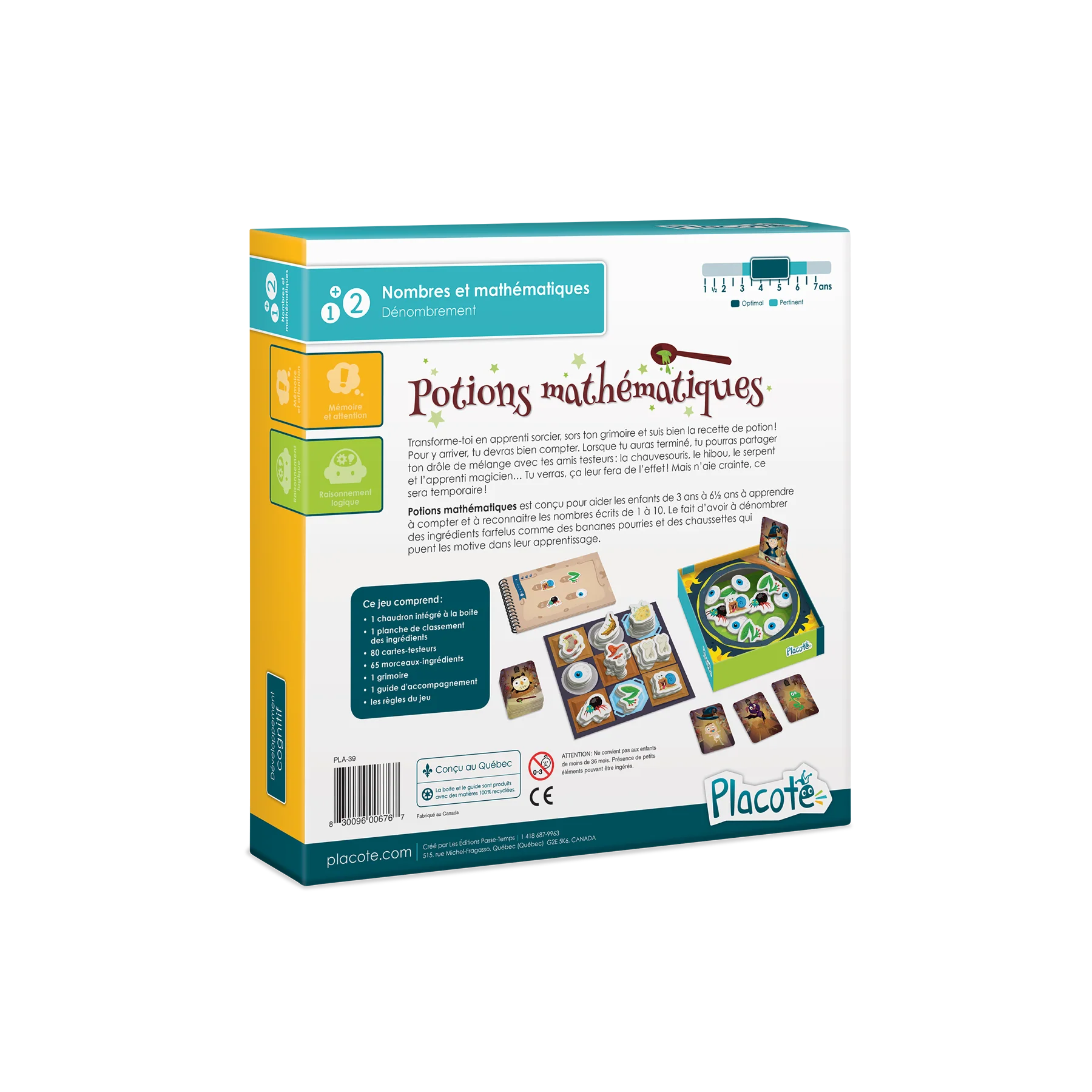 Objectif : Dénombrement Transforme-toi en apprenti sorcier, sors ton grimoire et suis bien la recette de potion! Pour y arriver, tu devras bien compter. Lorsque tu auras terminé, tu pourras partager ton drôle de mélange avec tes amis testeurs: la chauvesouris, le hibou, le serpent et l’apprenti magicien… Tu verras, ça leur fera de l’effet! Mais n’aie crainte, ce sera temporaire! Potions mathématiques est conçu pour aider les enfants de 3 ans à 6½ ans à apprendre à compter et à reconnaitre les nombres écrits de 1 à 10. Le fait d’avoir à dénombrer des ingrédients farfelus comme des bananes pourries et des chaussettes qui puent les motive dans leur apprentissage.