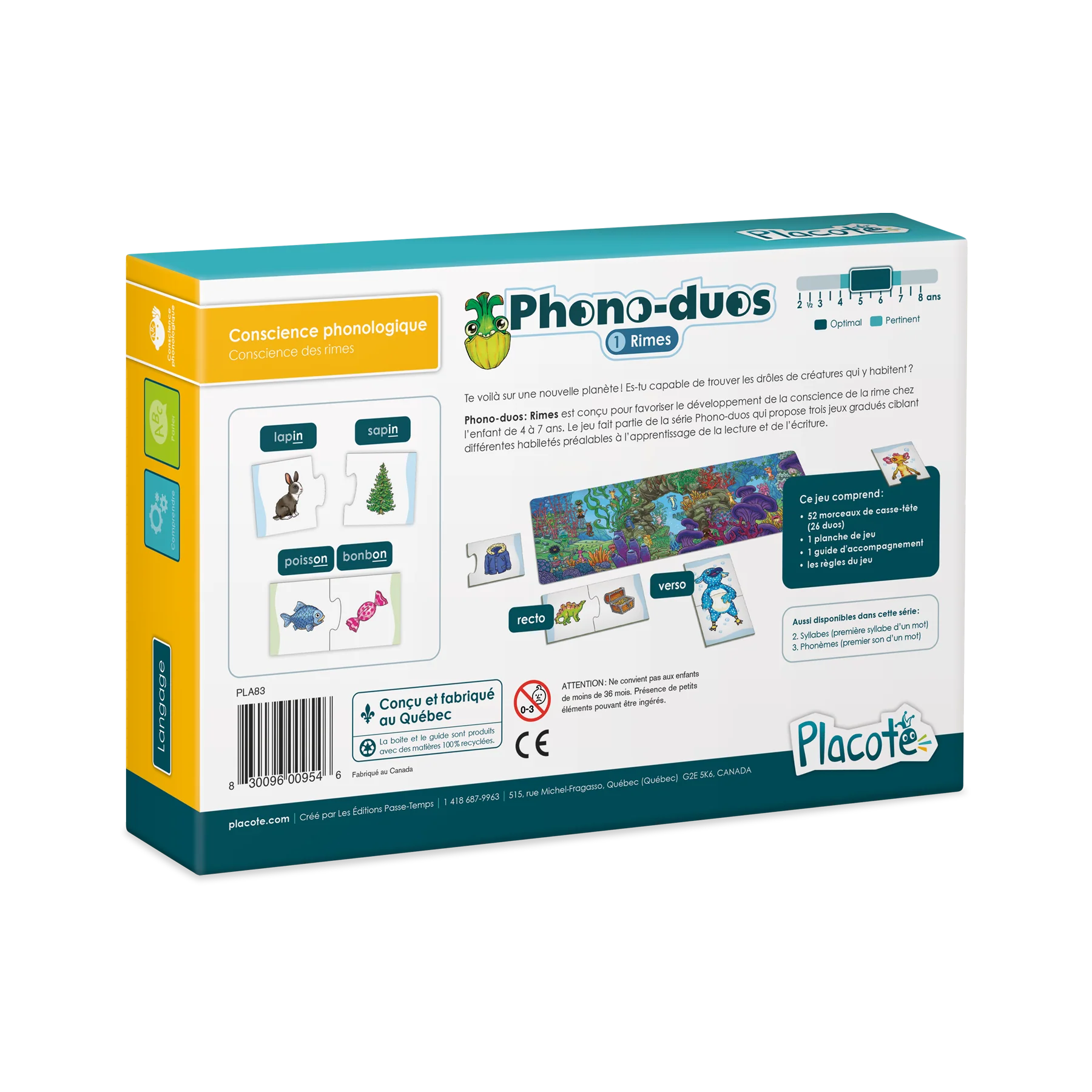Objectif : Conscience des rimes Te voilà sur une nouvelle planète! Es-tu capable de trouver les drôles de petites créatures qui y habitent? Phono-duos : Rimes est conçu pour favoriser le développement de la conscience de la rime chez l'enfant de 4 ans à 7 ans. Le jeu fait partie de la série Phono-duos qui propose cinq jeux gradués ciblant différentes habiletés préalables à l'apprentissage de la lecture et de l'écriture.