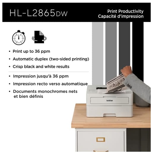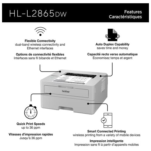 L’imprimante laser monochrome sans fil compacte HL-L2865DW est un choix judicieux pour les petits bureaux et les petits groupes de travail. Offrant des vitesses d’impression rapides allant jusqu’à 36 ppm(1), une fonction d’impression recto verso automatique par défaut qui permet d’économiser du papier et une gestion polyvalente du papier, cette imprimante fiable a tout ce qu’il faut pour accroître la productivité. De plus, elle est compatible avec les cartouches de toner de remplacement à très haut rendement TN835 authentiques de Brother. Économiques, ces cartouches offrent des résultats durables et de qualité supérieure. Cette imprimante est dotée d’une interface sans fil bibande et d’une interface Ethernet faciles à configurer. Il est également facile de la partager sur un réseau sans fil ou câblé, et elle prend en charge l’impression à partir d’appareils mobiles(3). Cet appareil comprend aussi des fonctions de sécurité avancées qui le protègent contre toute utilisation non autorisée et sécurisent les documents sensibles. (1) Impression recto. Modification des paramètres par défaut requise. (2) Capacité maximale basée sur l’utilisation de papier 20 lb. (3) Application téléchargeable gratuitement et connexion à un réseau sans fil requises. La compatibilité peut varier selon le type d’appareil et le système d’exploitation.