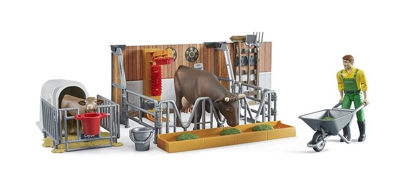 BRUDER-BWORLD COW AND CALF BARN W FARMER