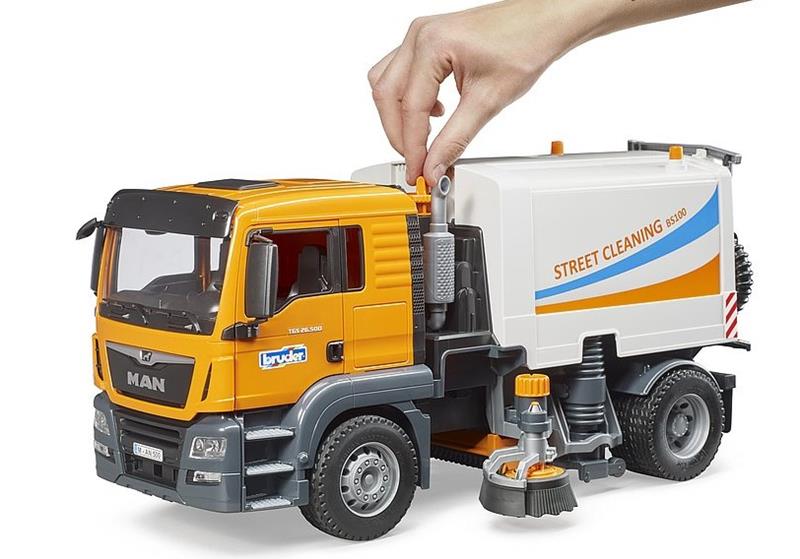 Road cleaning crews are an indispensable help for any municipality and form part of our everyday cityscape. No other vehicle can guarantee clean roads and pavements so effectively. BRUDER’s new road cleaning vehicle illustrates in detail how this exciting truck works. The MAN TGS is the perfect partner. Thanks to durable design, featuring powerful engines of up to 500 hp and providing an above-average payload, this lorry is the prototype of the frequently described all-round vehicle. The road sweeper body features two rotating and adjustable cleaning brushes that can also be adjusted in height. Consequently, you will also be able to reach areas that are hard to access. A long brush that is driven when the vehicle is in motion has been fitted under the vehicle to clean surfaces. The rear boasts the flexible hose including suction pipe to clean larger amounts of dirt. The waste container can simply be tilted, and the rear door opens to empty the unit. The vehicle’s impressive suction system is additionally revealed when the body has been tilted. The road cleaning vehicle can optionally be enhanced by a light and sound module (item no. 02801/02802). Children can perfectly combine this product with the bworld municipal worker (item no. 62130) from the comprehensive bworld themed world to further enhance the fun and games.