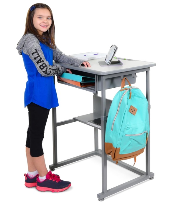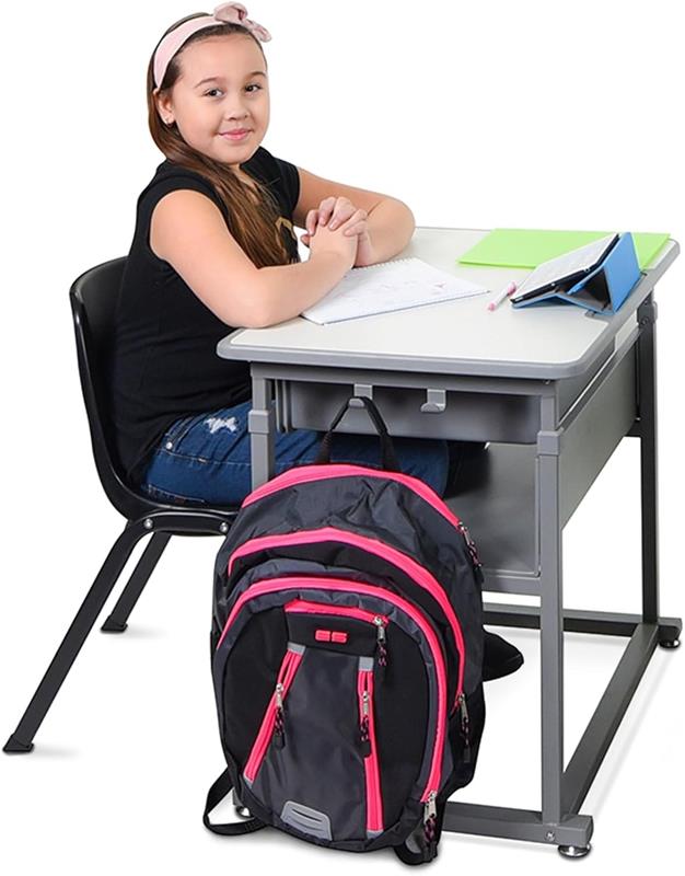 Éprouvé pour augmenter la concentration des élèves et leur capacité à rester sur la tâche. Idéal pour le primaire et le lycée Les élèves peuvent alterner entre assis et debout pour un apprentissage optimal. Grand espace de rangement avec boîte à livres ouverte et étagère Élimine l'encombrement de la salle de classe avec des crochets pour sacs à livres et manteaux. Fabriqué aux États-Unis Dimensions totales (l x P x H) : 69,5 x 49,5 x 62,2 - 106,7 cm. Dimensions du bureau : 69,5 x 49,5 cm. Poids : 17,5 kg Poids maximal supporté : 100 kg. Fabrication de bureau : surface stratifiée. Assemblage requis Conforme aux normes ANSI/BIFMA et CPSIA. Hauteur réglable entre 62,2 cm et 106,7 cm ; la clé hexagonale ajuste facilement quatre pieds aux lignes marquées en pouces
