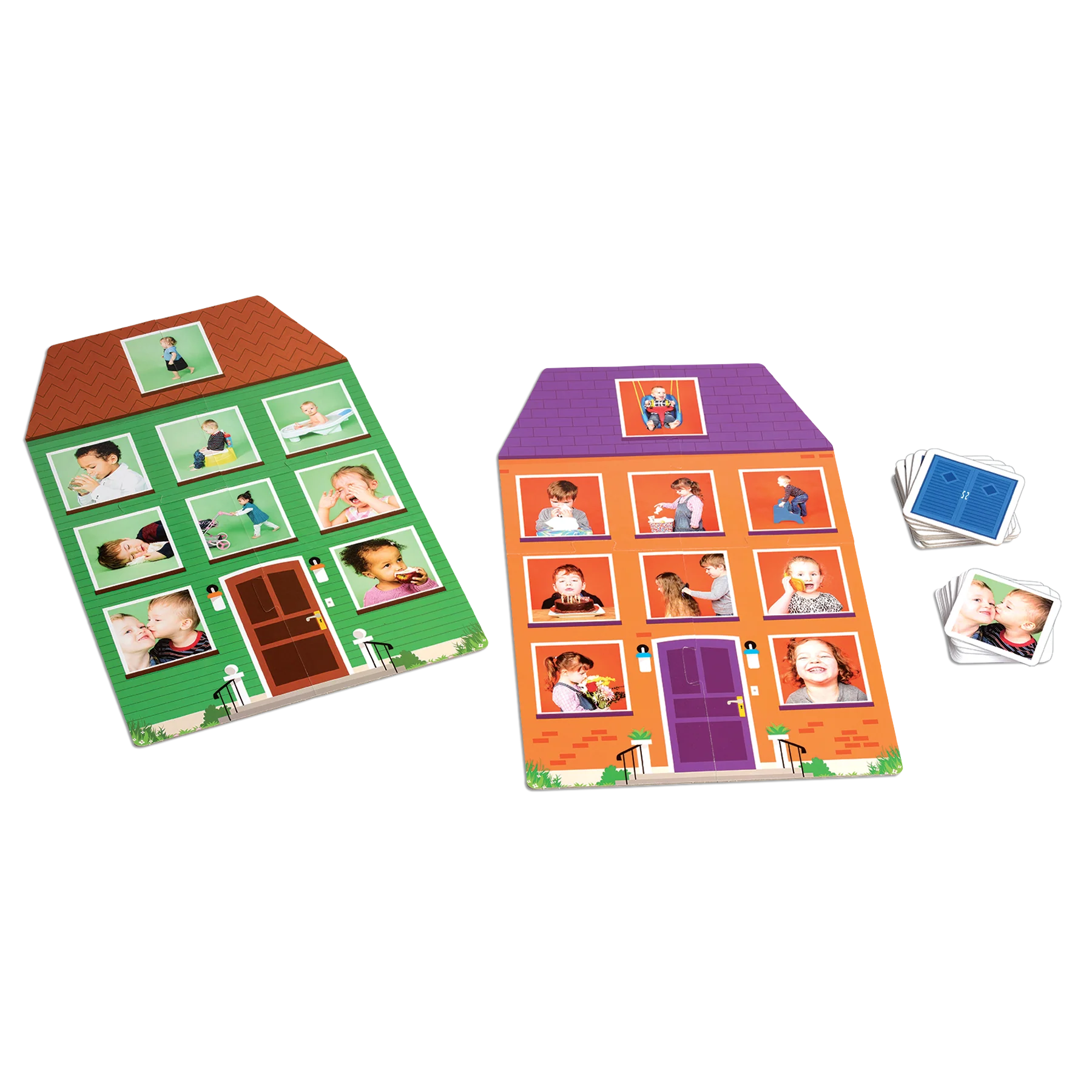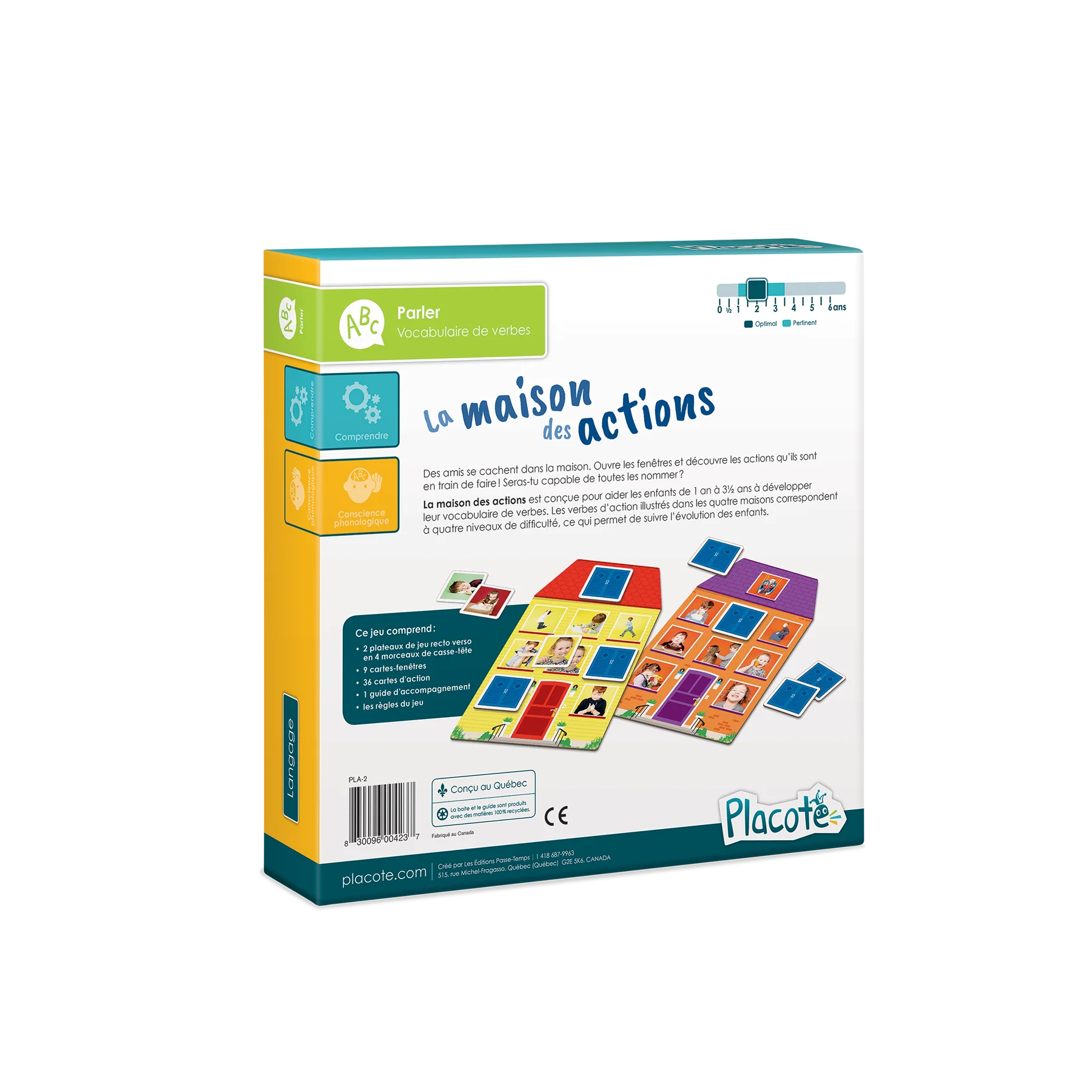 Objectif : Vocabulaire de verbes Des amis se cachent dans la maison. Ouvre les fenêtres et découvre les actions qu’ils sont en train de faire! Seras-tu capable de toutes les nommer? La maison des actions est conçu pour aider les enfants de 1 an à 3½ ans à développer du vocabulaire de verbes. Les verbes d'action illustrés dans les quatre maisons correspondent à quatre niveaux de difficulté, ce qui permet de suivre l'évolution des enfants.