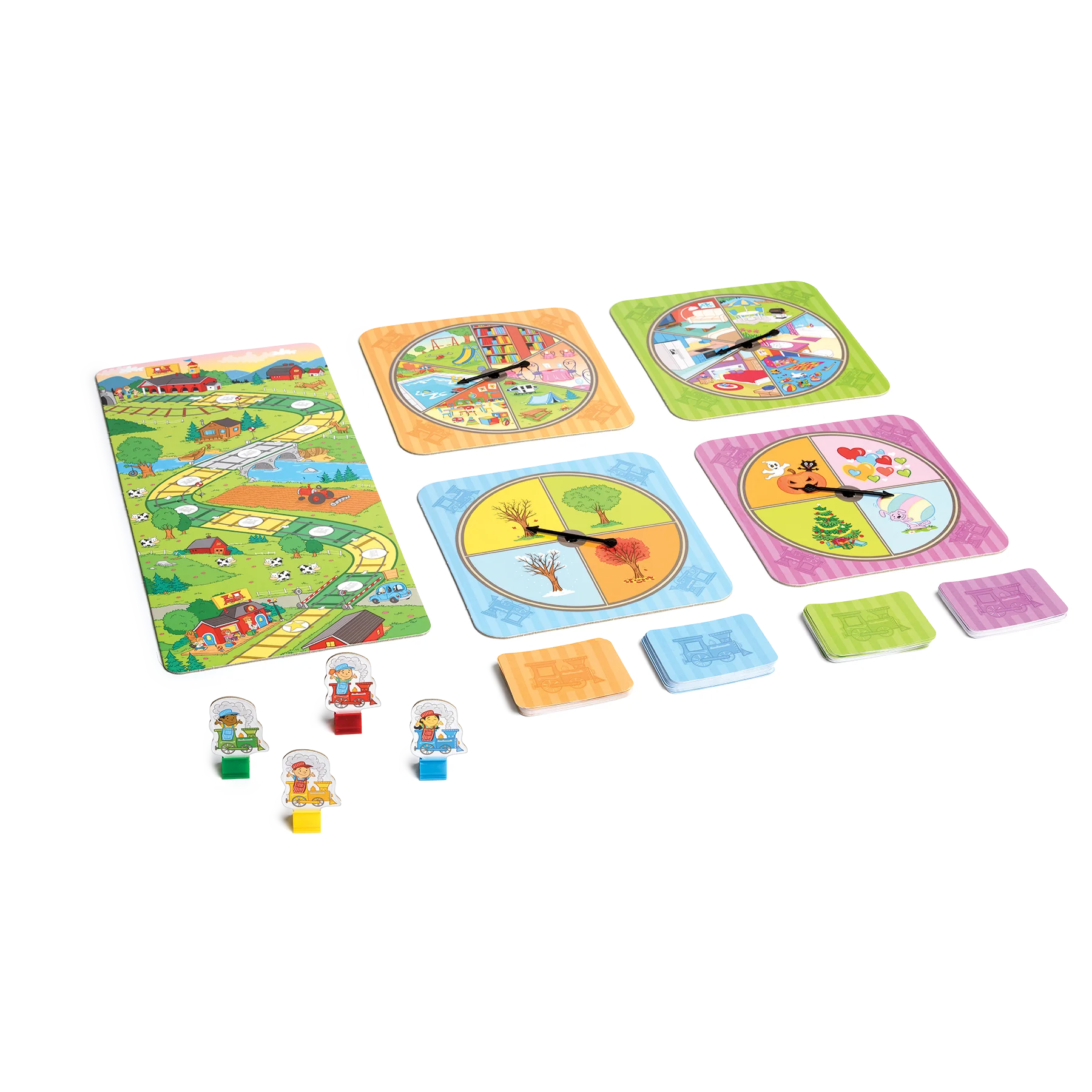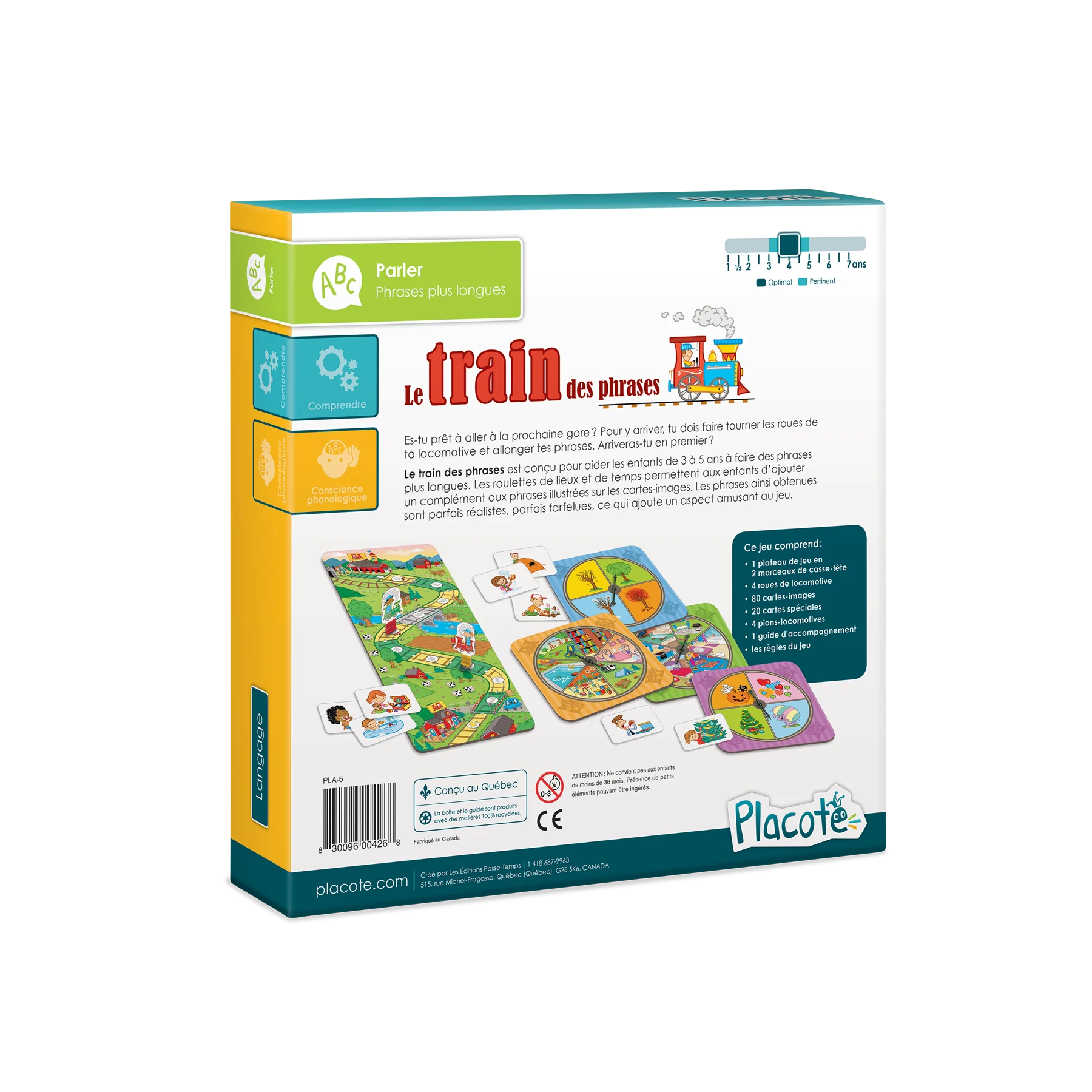 Objectif : Phrases plus longues Es-tu prêt à aller à la prochaine gare? Pour y arriver, tu dois faire tourner les roues de ta locomotive et allonger tes phrases. Arriveras-tu en premier? Le train des phrases est conçu pour aider les enfants de 3 à 5 ans à faire des phrases plus longues. Les roulettes de lieux et de temps permettent aux enfants d'ajouter un complément aux phrases illustrées sur les cartes-images. Les phrases ainsi obtenues sont parfois réalistes, parfois farfelues, ce qui ajoute un aspect amusant au jeu.