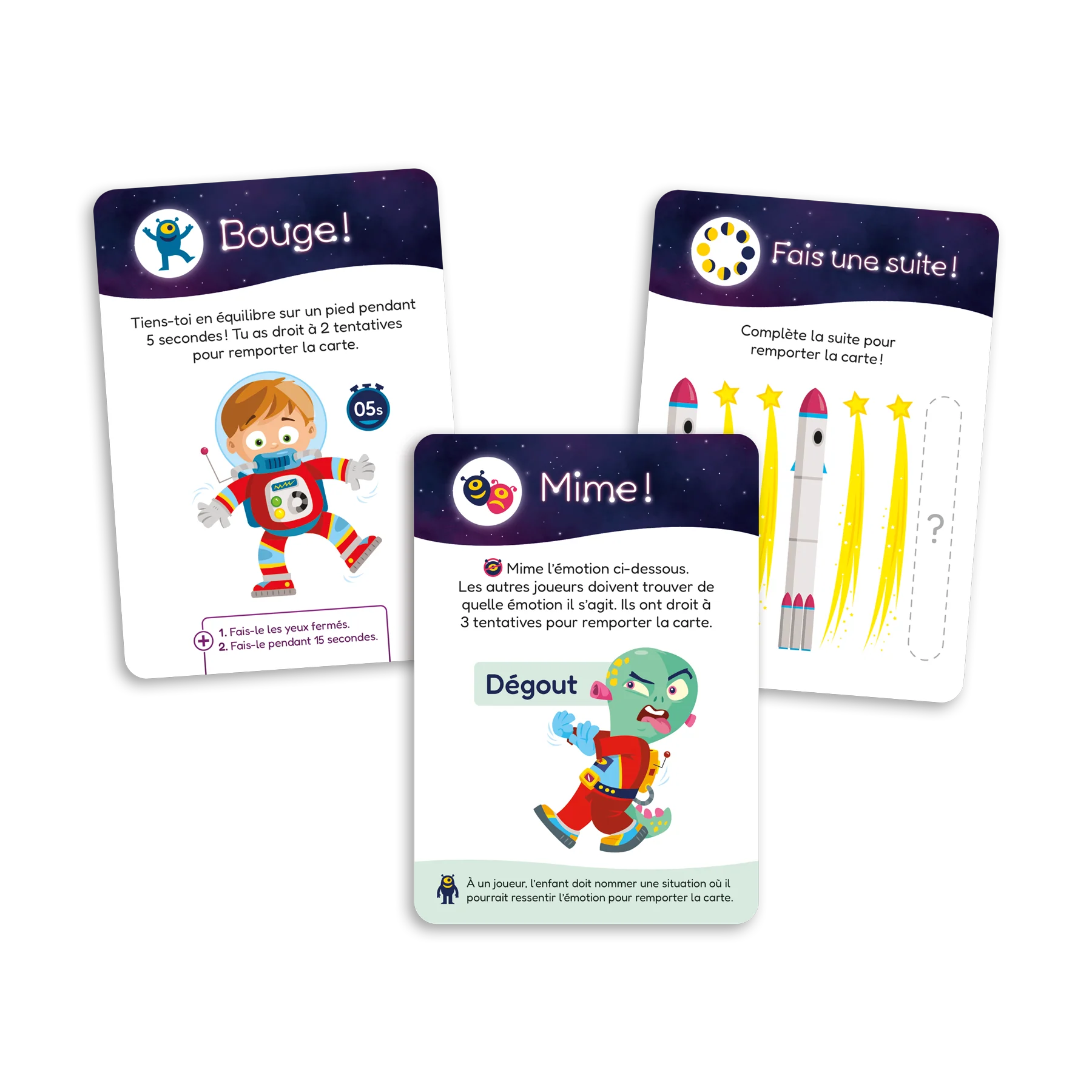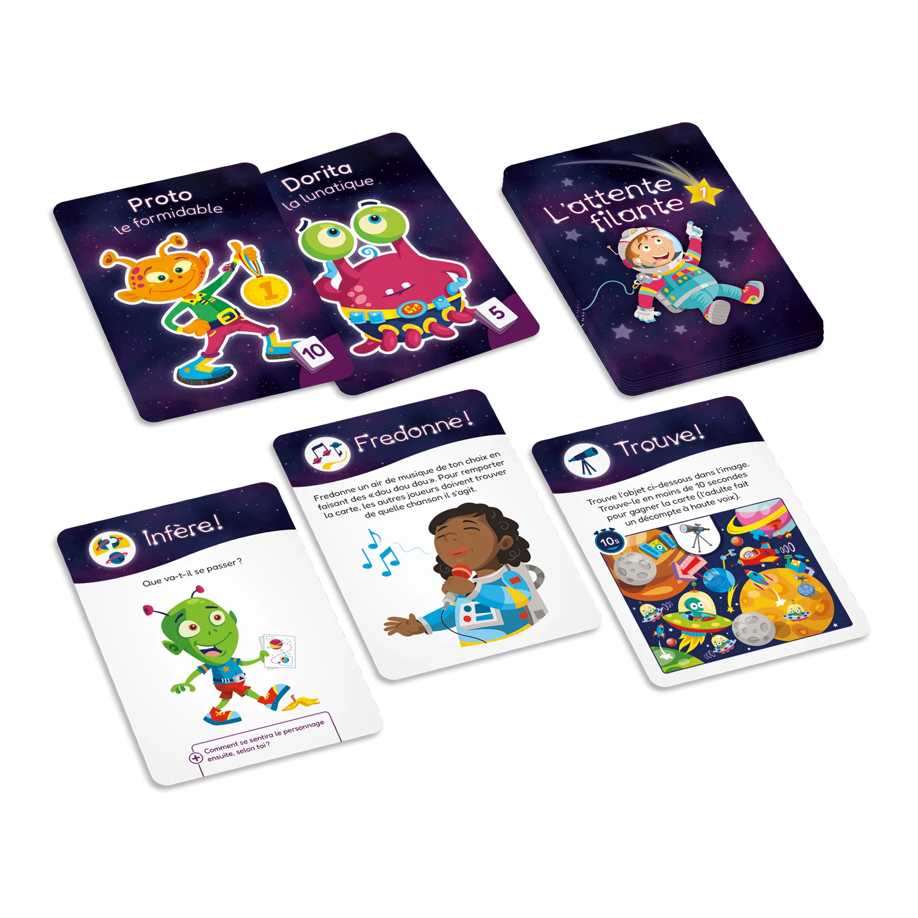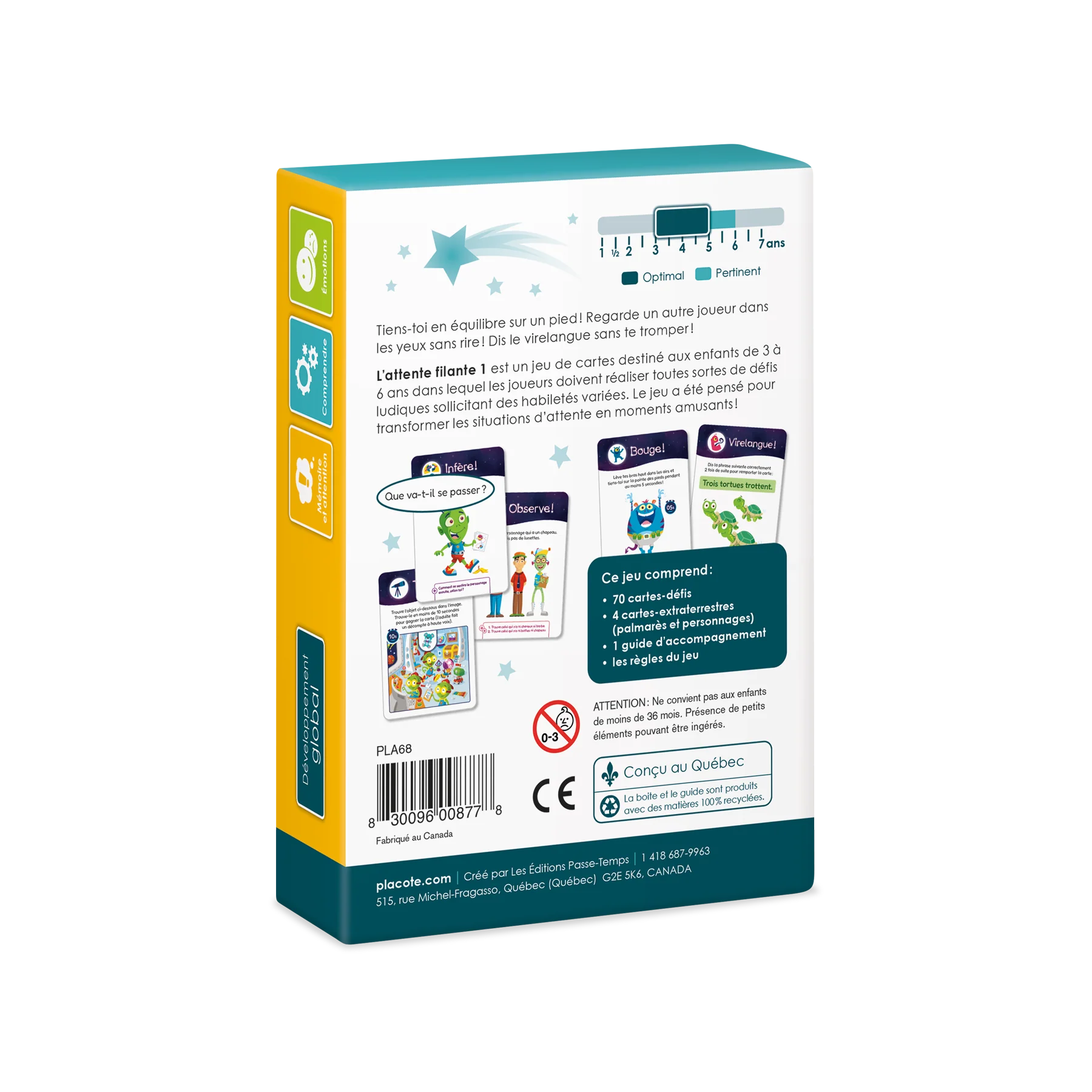 Objectif : Stimuler le développement des habiletés langagières, socioaffectives, cognitives et motrices Tiens-toi en équilibre sur un pied! Regarde un autre joueur dans les yeux sans rire! Dis le virelangue sans te tromper! L’attente filante 1 est un jeu de cartes destiné aux enfants de 3 à 6 ans dans lequel les joueurs doivent réaliser toutes sortes de défis ludiques sollicitant des habiletés variées. Le jeu a été pensé pour transformer les situations d’attente en moments amusants!